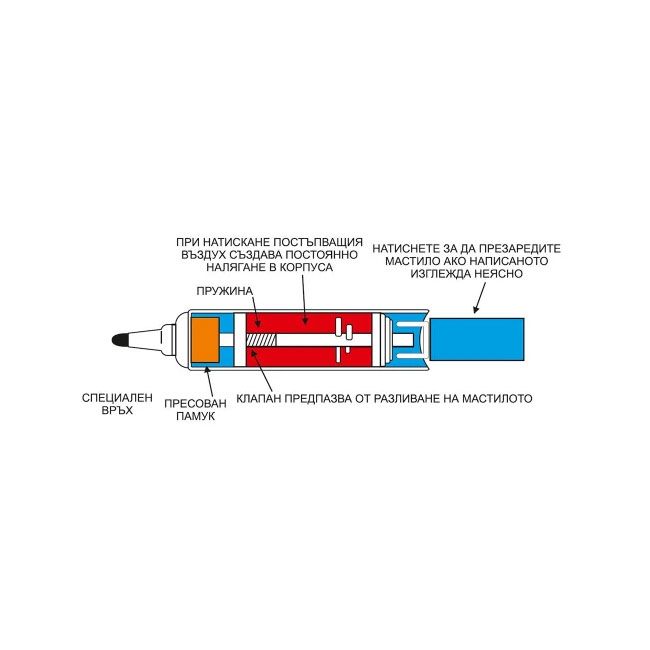 Ако го оставите без капачка и върхът изсъхне, просто използвайте вградената помпичка, за да подадете мастило и да продължите да пишете.