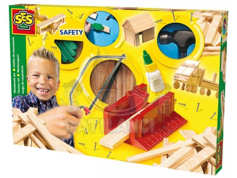 Дърводелски комплект с чук SES Creative е творчески комплект за малките майстори, който им позволява да правят различни сглобки, да мерят и да режат с трион фигурите, от които имат нужда.